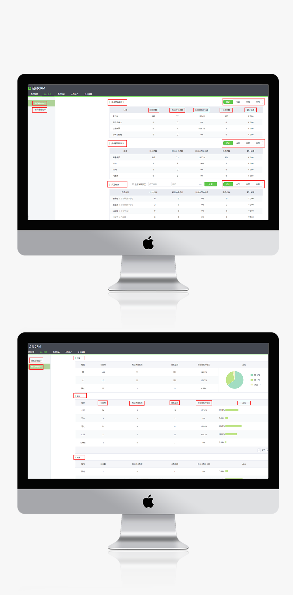 不同屬性統(tǒng)計(jì):會(huì)員的性別、省份、城市占比情況一目了然,為企業(yè)提供更具體的運(yùn)營(yíng)參考數(shù)據(jù)。