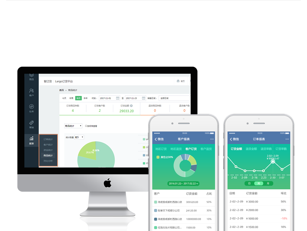 系統(tǒng)提供各類(lèi)報(bào)表(訂單統(tǒng)計(jì)、客戶統(tǒng)計(jì)、資金統(tǒng)計(jì)、商品統(tǒng)計(jì)、對(duì)比分析),省去人工報(bào)表的繁瑣,還能一鍵導(dǎo)出